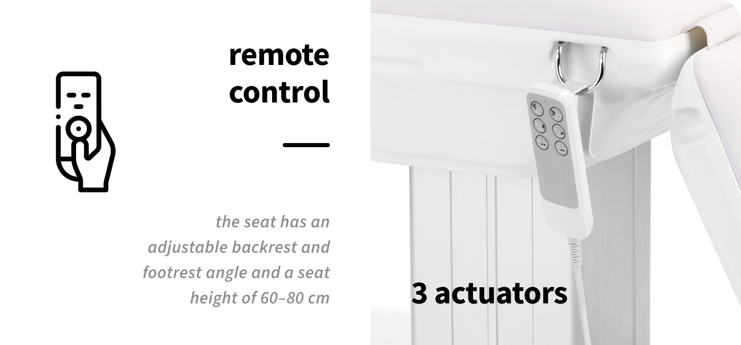 An intuitive remote control allows the chair to be adjusted in 3 planes – height, backrest and footrest angle. This enables the chair to be smoothly adjusted into a comfortable reclining position, allowing both facial and body treatments to be carried out comfortably on the chair. The seat height is adjustable from 60 cm to 80 cm, allowing the position to be comfortably adjusted to suit the height of both client and practitioner. When fully extended, the chair is over 2 metres long, providing comfort for taller users. For added convenience , the remote control can be hung on the handles located on either side of the seat, making it easy to store and ensuring it is always to hand.