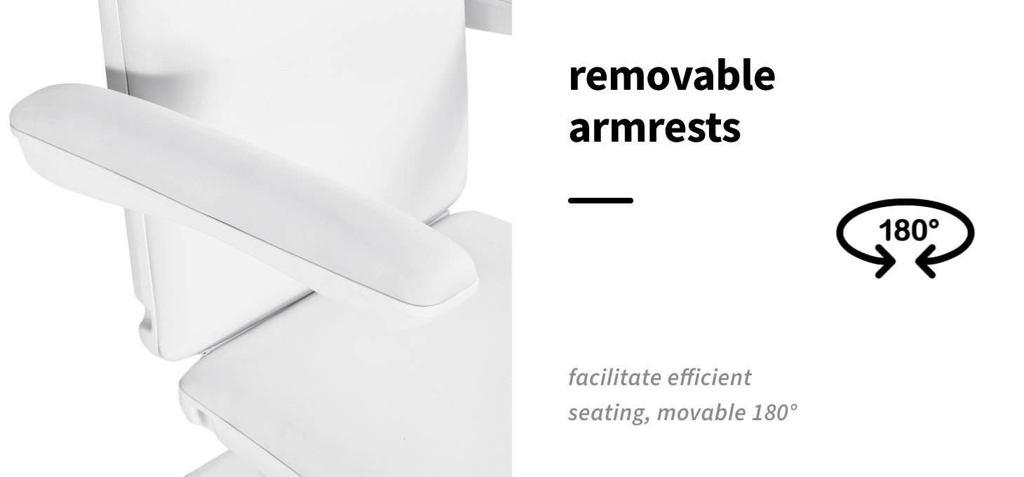 The headrest, which can be extended by 20 cm, allows the chair to be adjusted to the user’s height, providing stable support for the head during treatments. The movable armrests, which can be rotated through 180°, make it easy to sit down and provide comfortable access for the practitioner. They can also be easily removed when needed. These features enhance user comfort and support ergonomic work organisation.
